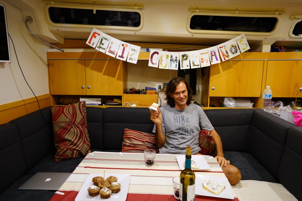 I still had all the intention to make sure it was a special day for the “birthday boy”. I decorated the boat a little bit for the occasion so as soon as he woke up he could see a nice banner “Feliz Cumpleaños”. We also had a Zoom call with the french family the day before. Everybody was confined to their houses so it was really easy to connect with Toulouse, La Ciotat and Paris.