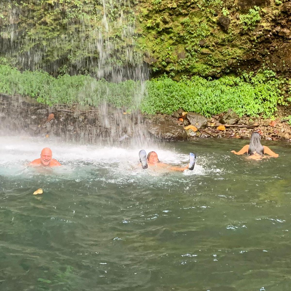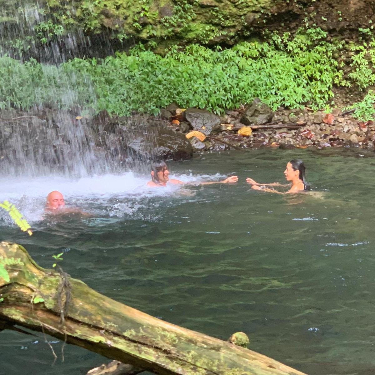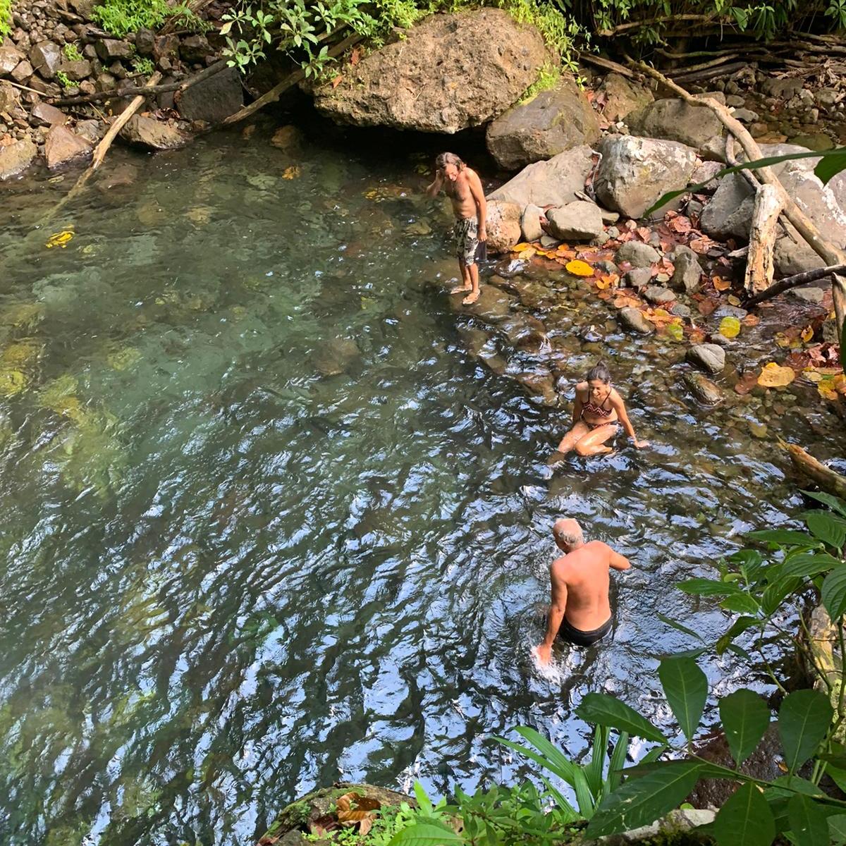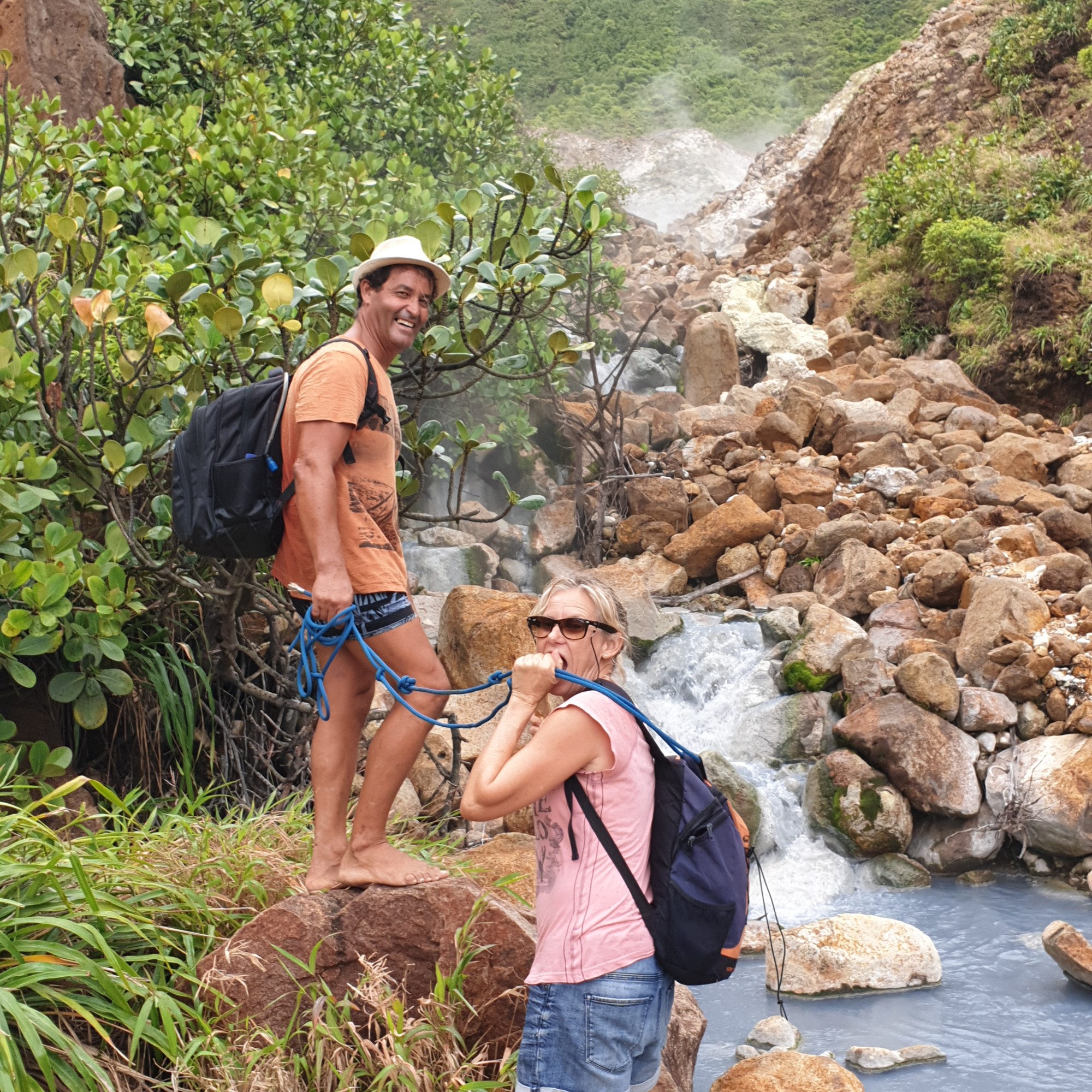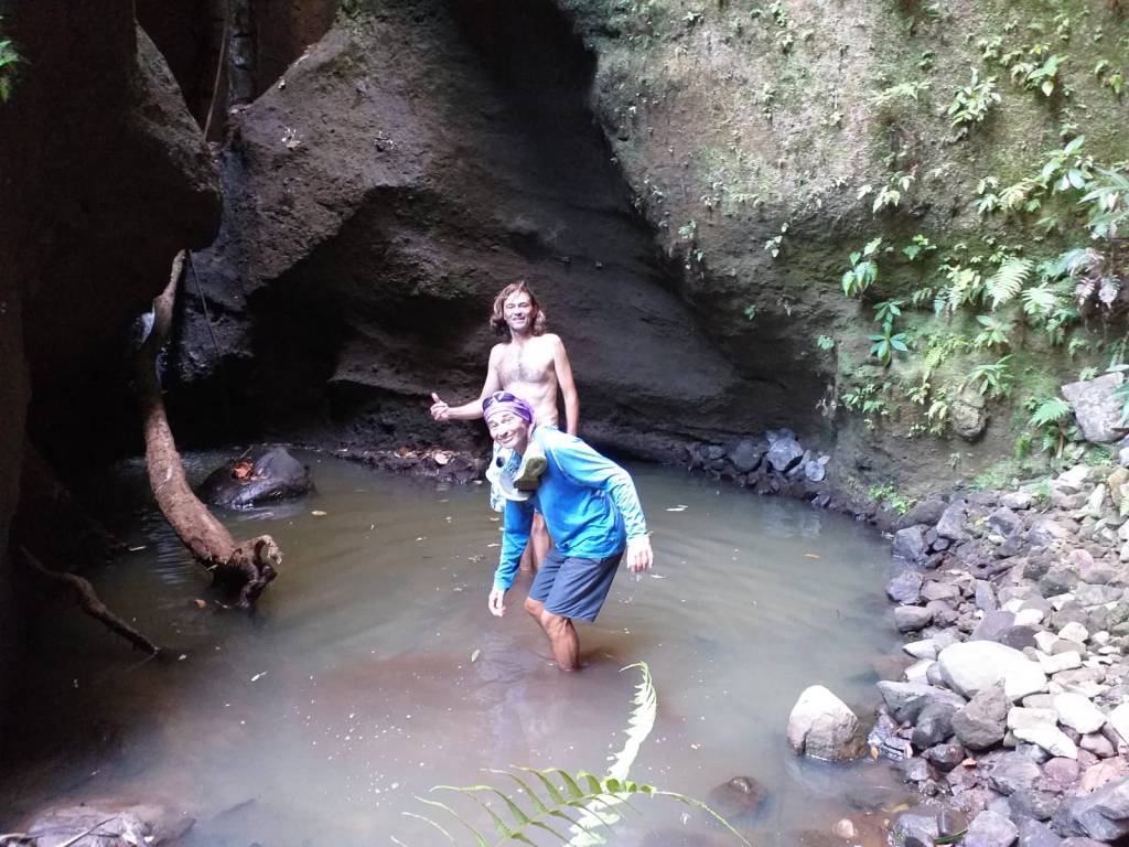 on, he held the rope and help me, it was excellent to have that extra support. He is very used to the rope and Viviane takes it all the time. We did an amazing, very hard hike thru a very rough terrain. Parts of the trail are easy to follow but some of them have ropes, missing steps, river crossings and so much more. For four hours, we kept going up and down under the sun, bit of rain and lots of mud. The views from the ridge are fantastic. The trail has various environments dense vegetation, a desolation valley and the streams that need to be cross several times. 30 minutes to the end you can start seeing places with the vapour coming up. Finally, at the top a cauldron of bubbling greyish-blue water enveloped in a cloud of vapour. Great walking team, we made it!!! Had some lunch and another four hours of hike. We finished with a refreshing cooldown at the entrance of Titou Gorge.