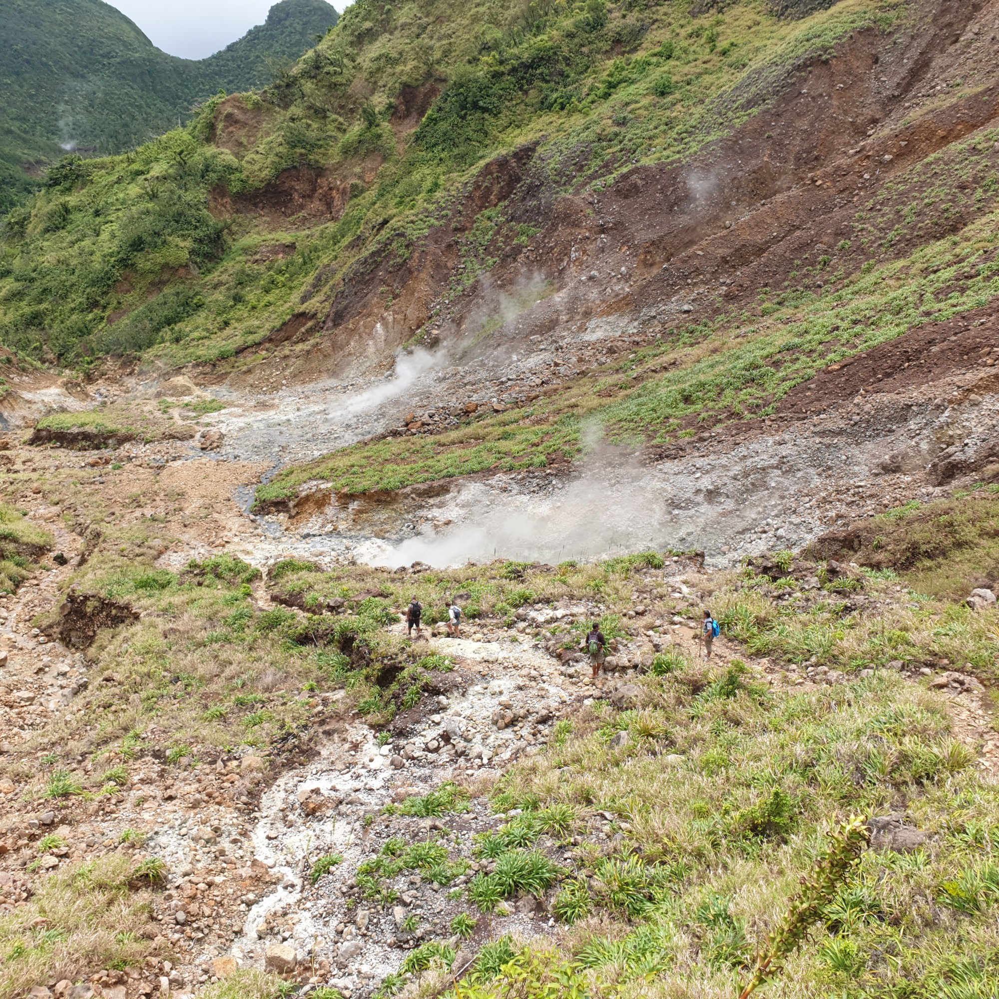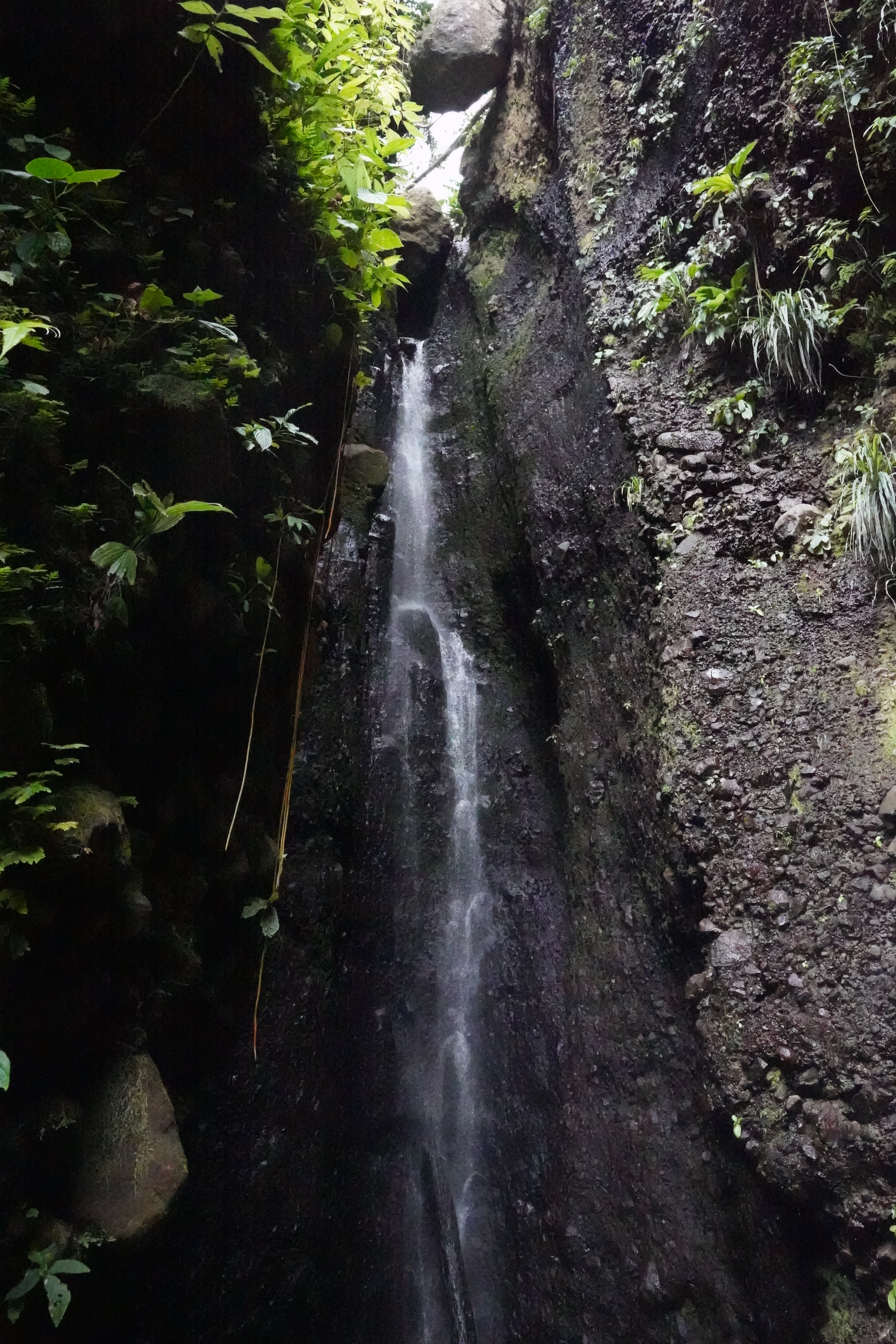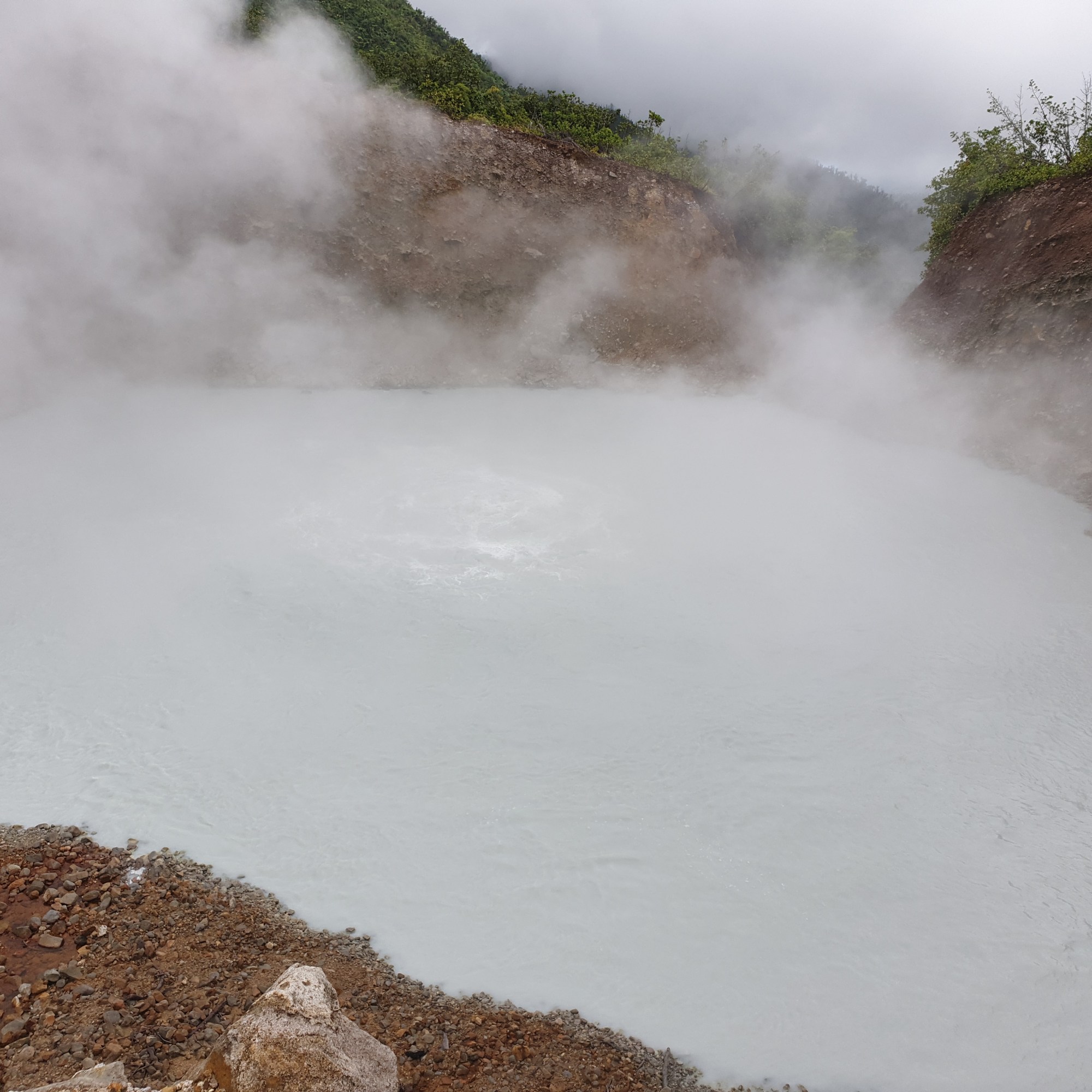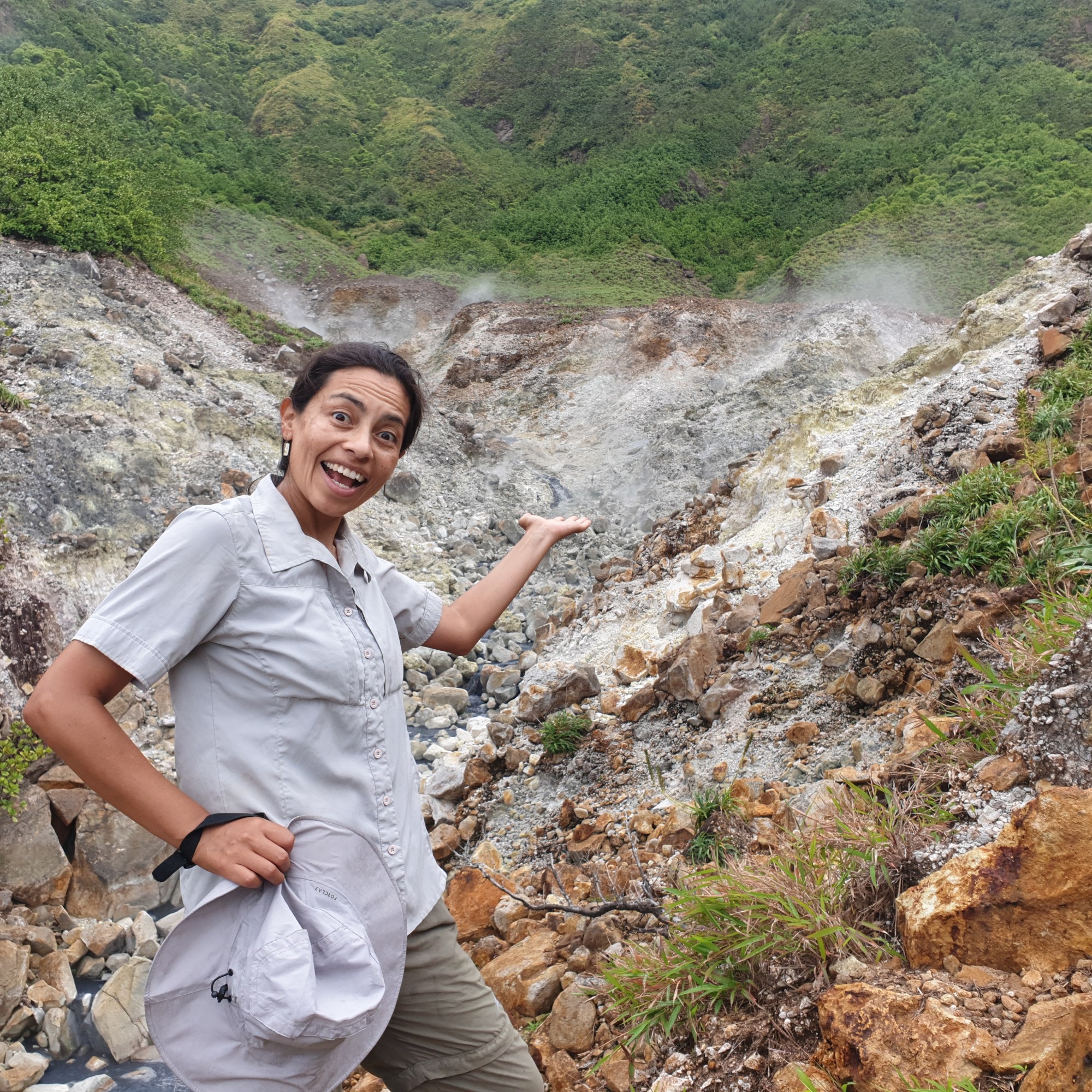 on, he held the rope and help me, it was excellent to have that extra support. He is very used to the rope and Viviane takes it all the time. We did an amazing, very hard hike thru a very rough terrain. Parts of the trail are easy to follow but some of them have ropes, missing steps, river crossings and so much more. For four hours, we kept going up and down under the sun, bit of rain and lots of mud. The views from the ridge are fantastic. The trail has various environments dense vegetation, a desolation valley and the streams that need to be cross several times. 30 minutes to the end you can start seeing places with the vapour coming up. Finally, at the top a cauldron of bubbling greyish-blue water enveloped in a cloud of vapour. Great walking team, we made it!!! Had some lunch and another four hours of hike. We finished with a refreshing cooldown at the entrance of Titou Gorge.