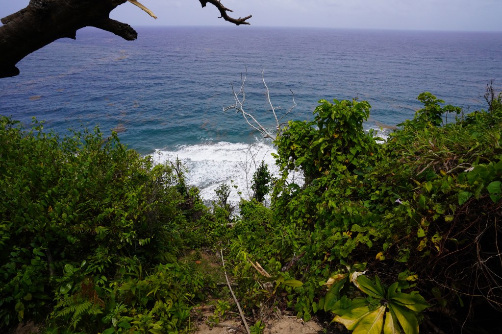 All happy with our shopping and happy we still have time left in the day to keep exploring, we headed to Riviere Cyrique falls, which we had seen some pictures and it looked really impressive as the waterfall drops to the sea. We got there and the gentleman at the entrance of the private property looked at us and told us that we were on the right track. He also said “there is a stair, so you have to be careful”, he didn’t seemed convinced we were gonna make it. Half an hour later I understood why. The trail reached a point where the only thing you could see is a rope but it is impossible to see the other side of the rope. And the rope looks like going to the void. We looked around and tried some other alternative but finally we gave up. It seemed too risky to try to go down.