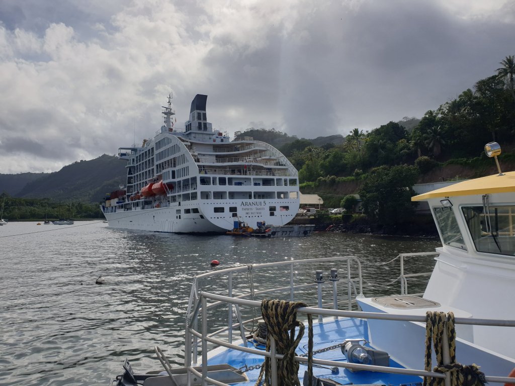 Things got worst when Vincent came and told us, Thursday was not going to be possible. The big supplies boat “Tapporo” comes once a month and it was there. The Aranui which is half cargo half passengers was also there and one of his lines was tided to the other side of the bay blocking the entrance to the shipyard. Against all the odds what really saved us was the the inter islands ferry, which also was in the bay needing to leave and was bock by the lines of the Aranui. Both boats are from the same company so the Aranui had to lift his line so the ferry could leave. So we only had an hour to make the manoeuvre and it had to be at 1:30pm with the highest tie otherwise there was not enough room for the keel.