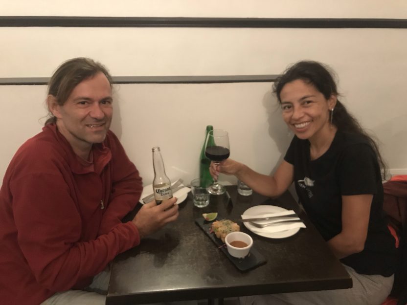 Anyway, everything ready for our visitors, including the French, Spanish, Australian and Colombian flags flying up high. Around 2pm, Rene and Belen arrived. With a little companion, Vishnu – a toy poodle! First time we had a dog on board. He is so cute! We were all so excited to meet again. In the original plan, they were supposed to visit us in French Polynesia and that obviously didn’t happen, so the fact that we could actually meet and they could see Happy Days was really amazing. After lots of hugs and kisses. We did a quick tour of the boat and set up for lunch. They brought an incredible seafood platter, we cheered and talked non-stop to update each other on our last 18 months and the plans ahead.